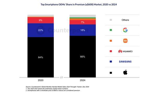 2024 年,苹果仍是该细分市场的领导者,占据了超过 67% 的高端设备市场份额。 紧随这家库比蒂诺巨头之后的是三星 、华为、小米和Google,后者将苹果的市场份额从一年前的 72% 拉下。